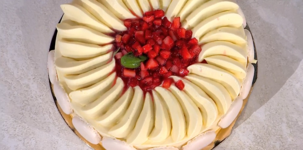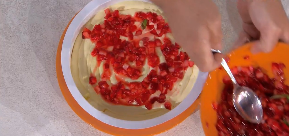All’interno di una tortiera, inseriamo il disco di meringa sul fondo. Copriamo con uno strato di crema al mascarpone, che usiamo per coprire anche i bordi della tortiera. Distribuiamo sullo strato di crema le fragole marinate. Poggiamo sopra il pan di Spagna inzuppato e copriamo con un altro strato di crema, altre fragole e ancora un disco di pan di Spagna. Copriamo con della crema a filo della tortiera. Congeliamo e sformiamo la torta. La capovolgiamo e la decoriamo a piacere.