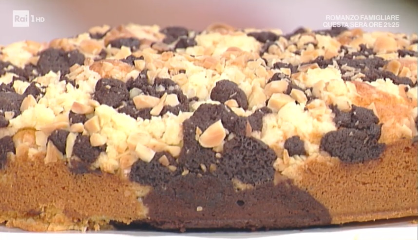 Per il crumble, lavoriamo il burro morbido con la farina e lo zucchero, fino ad ottenere delle briciole. Le distribuiamo sulla torta. Facciamo lo stesso per le briciole al cacao e finiamo con delle mandorle tritate. Inforniamo la torta per 35 minuti a 180°.