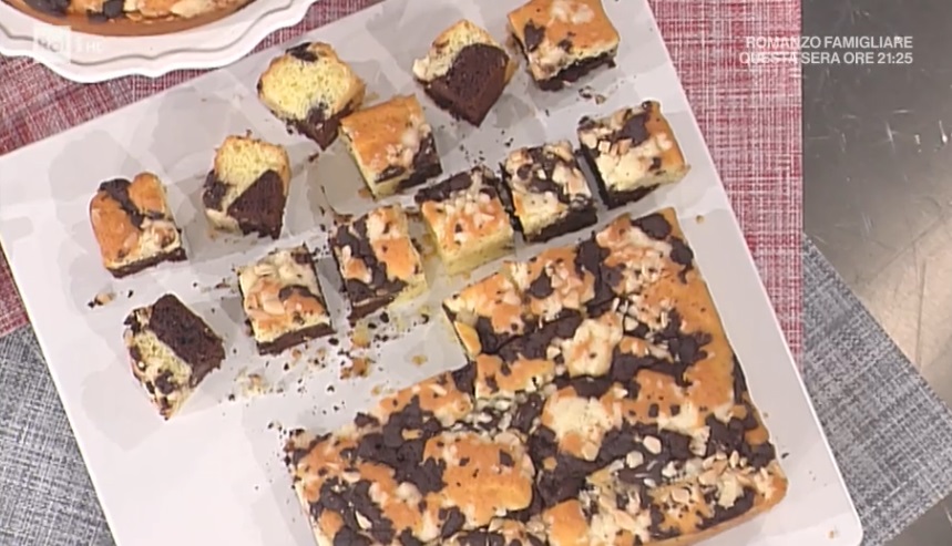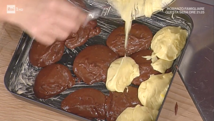 In una teglia rettangolare (o quadrata da 24 cm almeno) ben imburrata ed infarinata (oppure usiamo lo staccante di Natalia, qui la ricetta), distribuiamo il composto al cioccolato a cucchiaiate. Copriamo la superficie ancora libera con il composto chiaro, mettendolo a cucchiaiate.