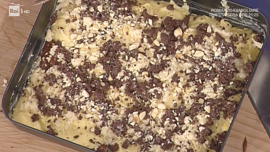 Per la parte al cioccolato, in una ciotolina, intanto, mescoliamo il cacao amaro in polvere al latte. Otterremo una sorta di crema. Uniamo a questa crema metà del composto della torta. Mescoliamo fino ad ottenere un composto omogeneo. Infine, incorporiamo il cioccolato tritato grossolanamente.