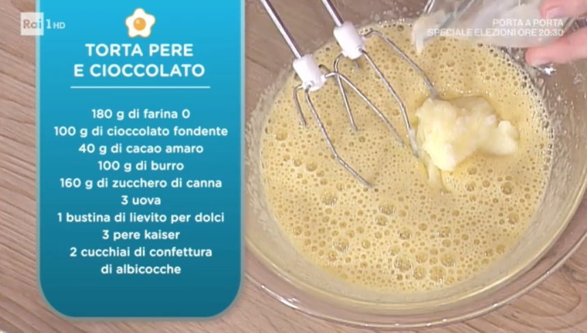 - 180 g farina 0, 100 g cioccolato fondente, 40 g cacao amaro, 100 g burro, 160 g zucchero di canna, 3 uova, 1 bustina di lievito per dolci, 3 pere Kaiser, 2 cucchiai di confettura di albicocche