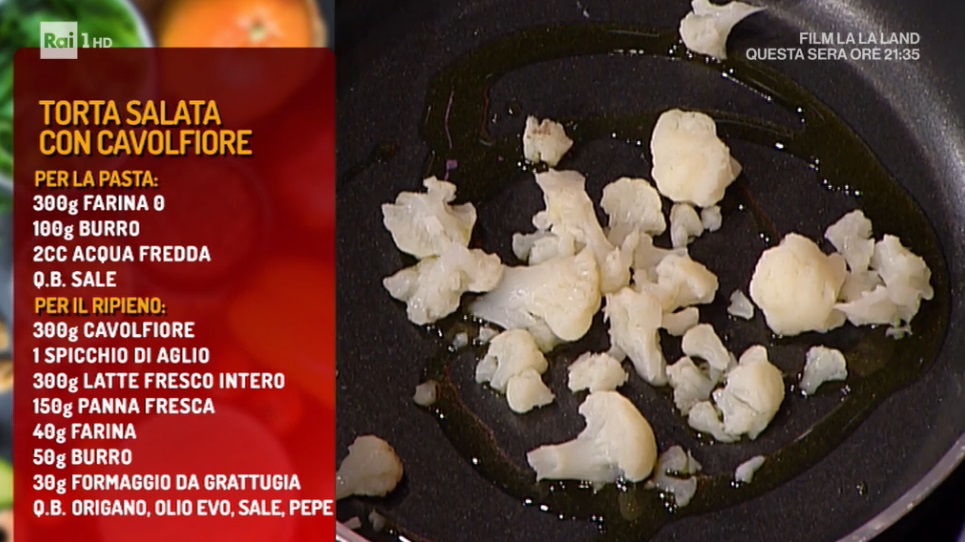 - Ripieno: 300 g cavolfiore, 1 spicchio d’aglio, 300 g latte intero, 150 g panna fresca, 40 g farina, 50 g burro, 30 g formaggio grattugiato, origano, olio, sale e pepe