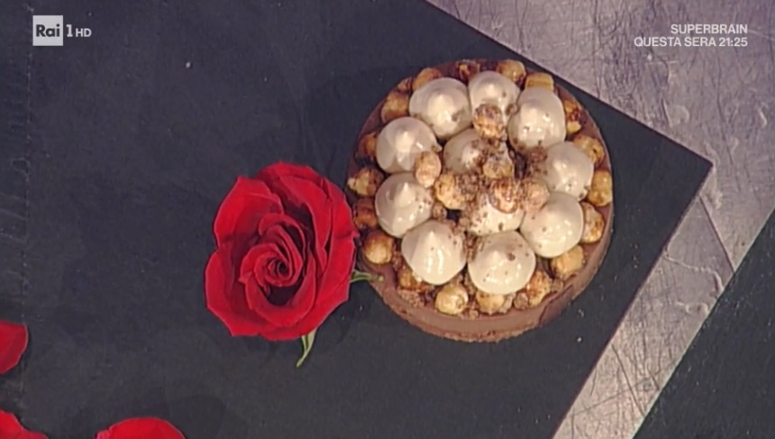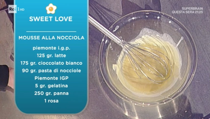- Mousse alla nocciola: 125 g latte, 175 g cioccolato bianco, 90 g pasta di nocciole, 5 g gelatina, 250 g panna, 1 rosa