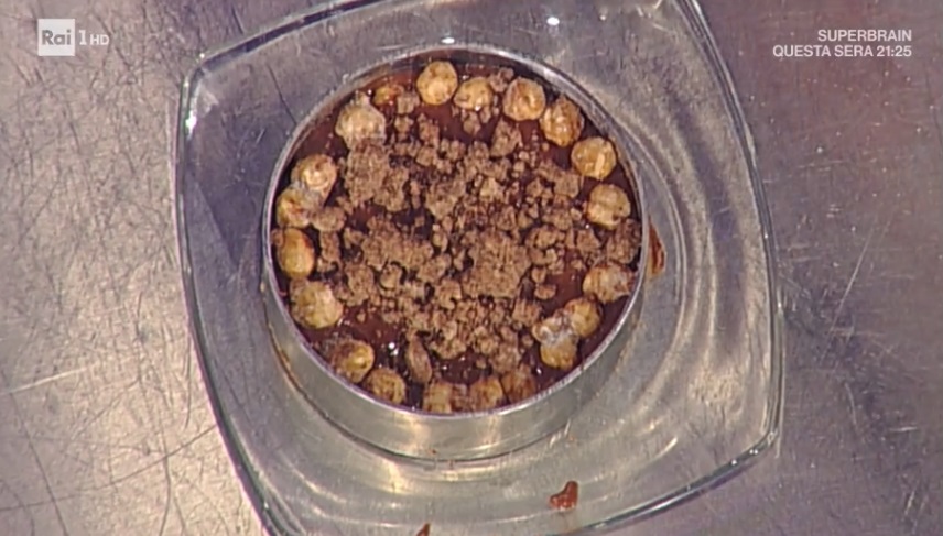 Disponiamo sopra le nocciole sabbiate, lungo tutta la circonferenza. Al centro, invece, mettiamo dei biscotti al cacao sbriciolati. Mettiamo in frigorifero.