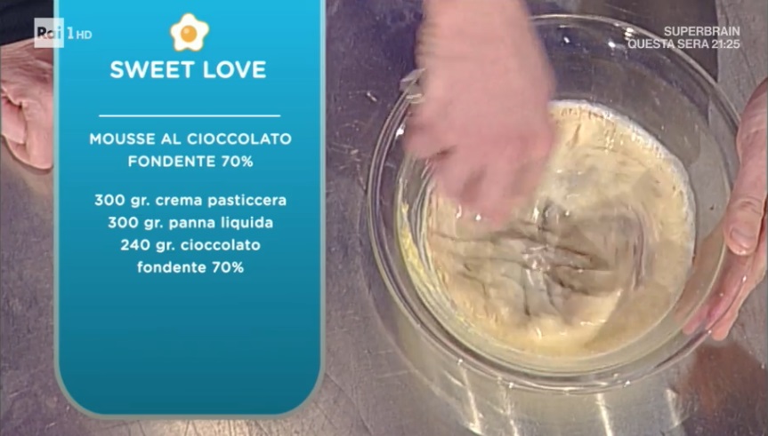 - Mousse al cioccolato fondente: 300 g crema pasticcera, 300 g panna liquida, 240 g cioccolato fondente 70%