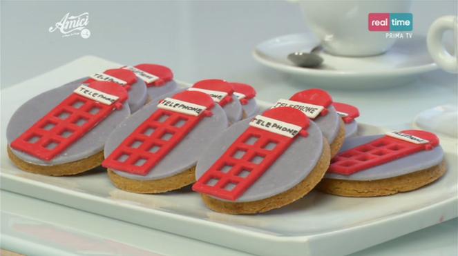 Per la decorazione: ricoprite un lato del biscotto con la pasta di zucchero. Per la base della cabina telefonica ricavate un rettangolo rosso con dei quadrati più piccoli all’interno. Fate il tetto della cabina con un coppapasta tondo e uno quadrato. Realizzate la base dell’insegna con un rettangolo in pasta di zucchero bianca e la scritta con un pennarello alimentare nero. Adagiate la cabina telefonica sul biscotto.