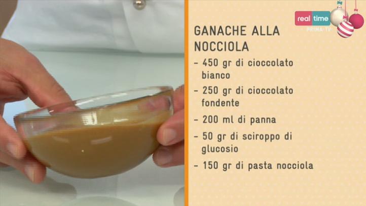 Per la ganache: sciogliere il cioccolato fondente e il cioccolato bianco a bagno maria. Scaldare la panna a circa 80 gradi (toglierla dal fuoco prima che bolla). Togliere la panna dal fuoco e aggiungere lo sciroppo di glucosio, la pasta alla nocciola e il cioccolato in più fasi. Lasciare raffreddare prima di coprire la torta.