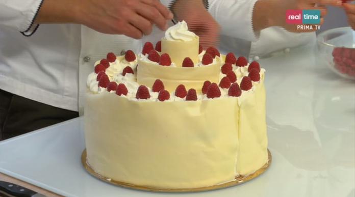 Ingredienti per la base: 300 g di cioccolato bianco, 200 g di farina, 1 kg di farina di mandorle, 1 bustina di lievito, 700 g di zucchero, 16 uova, 700 g di burro, scorza grattugiata di un limone. Per la farcitura: bagna al limoncello q.b., crema pasticcera q.b, lamponi q.b, panna montata q.b. Per la copertura: 1 kg di cioccolato bianco fuso, Panna montata q.b, Lamponi q.b.
