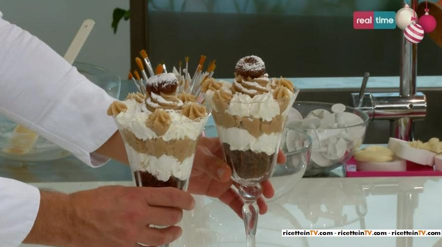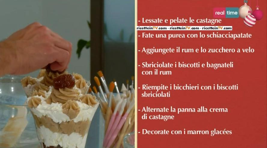 Nello spazio “SOS Renato“, all’interno della puntata odierna di Torte in corso, una telespettatrice, Patrizia, di Udine, scrive a Renato affinchè possa suggerirle una ricetta che le permetta di utilizzare in maniera golosa le castagne che cadono copiose dal suo castagno. Valutando le esigenze della spettatrice, il nostro pasticcere ha pensato di proporre la ricetta di un delizioso montblanc al bicchiere. Nella foto sottostante trovate l’elenco degli ingredienti necessari ed i passaggi che dovrete eseguire per realizzare il dolce.