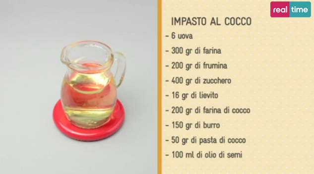 Ingredienti – 6 uova, 300 g di farina, 200 g di frumina, 400 g di zucchero, 16 g di lievito, 200 g di farina di cocco, 150 g di burro, 50 g di pasta di cocco, 100 ml di olio di semi.