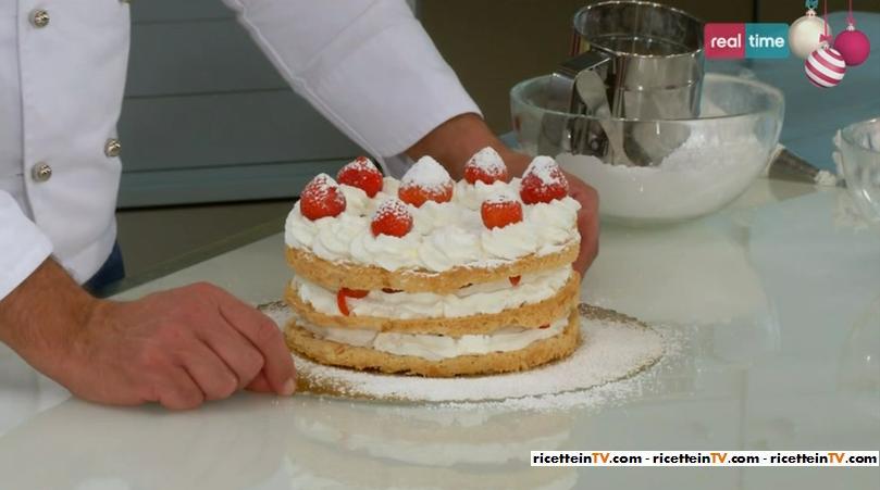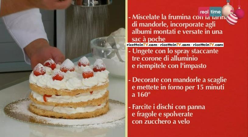 Nello spazio “SOS Renato“, all’interno della puntata odierna di Torte in corso, una telespettatrice siciliana, Veronica, scrive a Renato affinchè possa suggerirle una ricetta che le consenta di utilizzare gli albumi avanzati dalla preparazione di altre pietanze. Valutando le esigenze della spettatrice, il nostro pasticcere ha pensato di preparare un dolce tanto goloso, quanto romantico, una dacquoise panna e fragole. Nella foto sottostante trovate l’elenco degli ingredienti necessari ed i passaggi che dovrete eseguire per realizzare il dolce.
