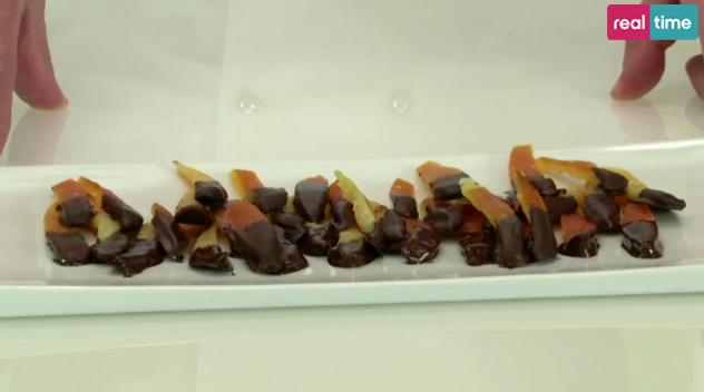 Procedimento – Prendere le scorze di arancia, metterle in una pentola con acqua e far bollire per 3 minuti. Scolare dal liquido e lasciar raffreddare le scorze di arancia per poi rimetterle nella pentola con acqua e far bollire per altri 3 minuti. Questa operazione va ripetuta per tre volte. Una volta pronte, aggiungere acqua, zucchero e portare ad ebollizione. Quando il composto si sarà addensato, mettere il tutto ad asciugare. Prendere il cioccolato e farlo sciogliere a bagnomaria. Una volta sciolto mettere il cioccolato in una ciotola e immergere all’interno le scorze di arancia. Una volta raffreddate sono pronte.