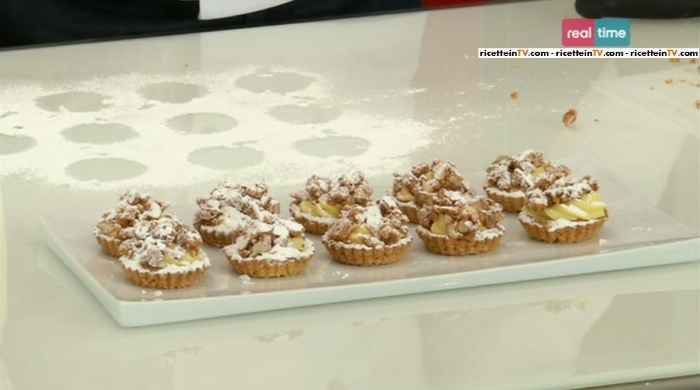 Nello spazio “SOS Renato“, all’interno della puntata odierna di Torte in corso, Renato, valutando le esigenze di una spettatrice, ha pensato di preparare delle tartellette con croccante di mandorle e nocciole. Nella foto sottostante trovate l’elenco degli ingredienti necessari ed i passaggi che dovrete eseguire per realizzare il dolce.