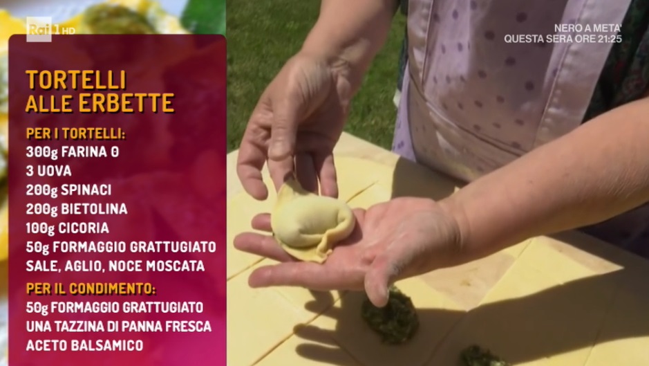 - Tortelli: 300 g farina 0, 3 uova, 200 g spinaci, 200 g bietolina, 100 g cicoria, 50 g formaggio grattugiato, sale, aglio, noce moscata