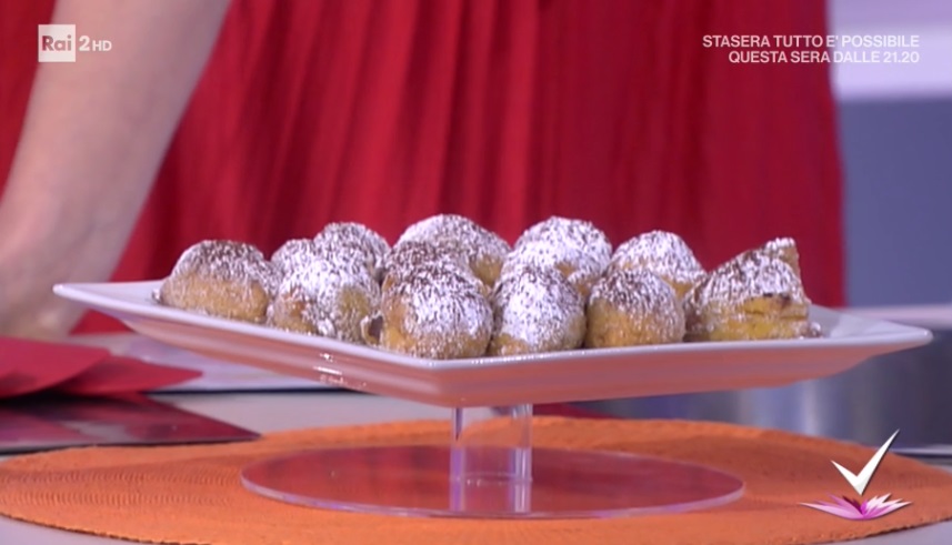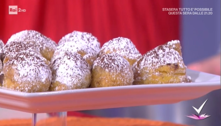 Farciamo le frittelle con la crema al cioccolato, le rotoliamo nello zucchero semolato e finiamo con zucchero a velo e cacao amaro in polvere.