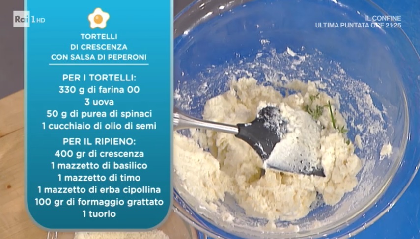 • Tortelli: 330 g farina 00, 3 uova, 50 g purea di spinaci, 1 cucchiaio di olio di semi