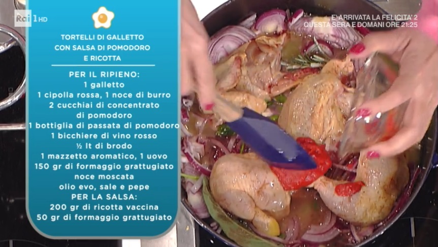 - Ripieno: 1 galletto, 1 cipolla rossa, 1 noce di burro, 2 cucchiai di concentrato di pomodoro, 1 bottiglia di passata di pomodoro, 1 bicchiere di vino rosso, mezzo l di brodo, 1 mazzetto aromatico, 1 uovo, 150 g formaggio grattugiato, noce moscata, olio evo, sale e pepe