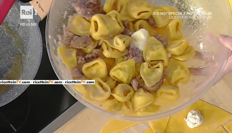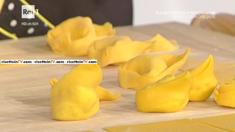Col suo Luiso in mano, Alessandra Spisni attende già un’acciaccata Antonella. Oggi, un primo piatto ‘regale’, i tortelli di ricotta e noci con salsiccia.