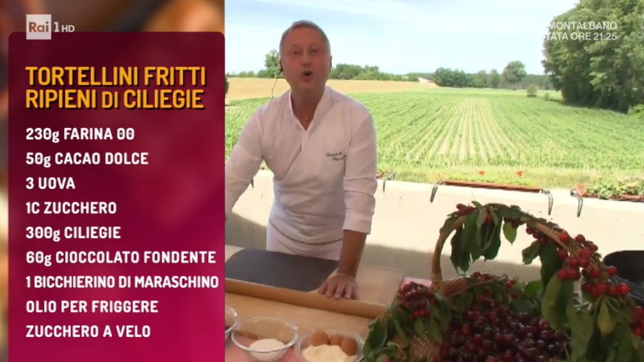 - Ripieno: 300 g ciliegie, 60 g cioccolato fondente, 1 bicchierino di maraschino, olio per friggere, zucchero a velo
