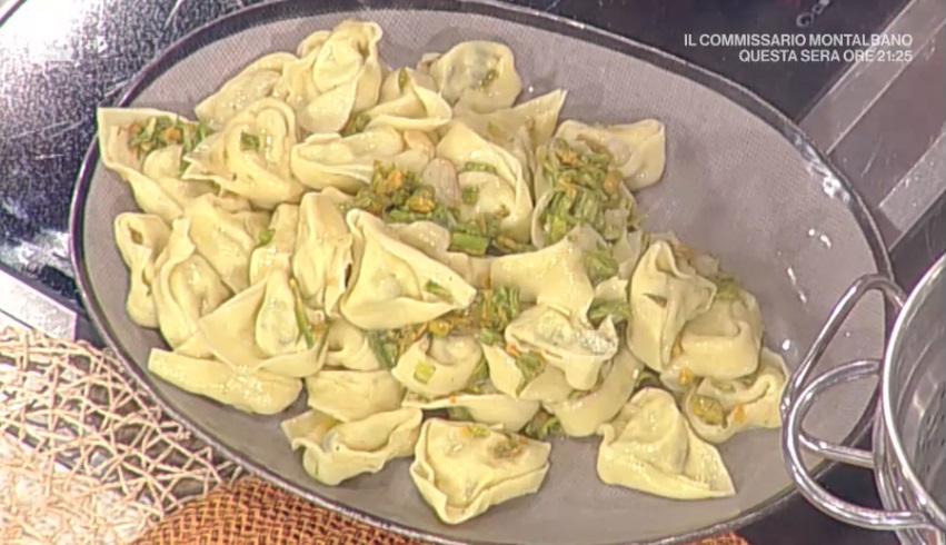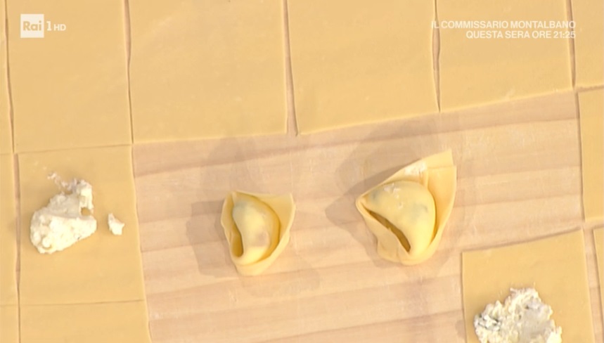 Sulla sfoglia formiamo dei ciuffi di ripieno. Copriamo con altra sfoglia e sigilliamo bene il ripieno, facendo uscire tutta l’aria. Diamo la forma di tortelloni. Lessiamo in acqua bollente e salata.