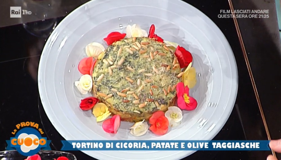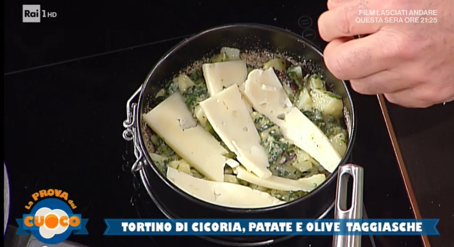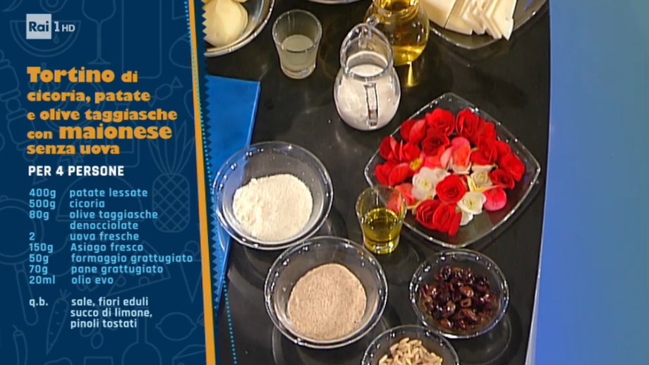 - 400 g patate lessate, 500 g cicoria, 80 g olive taggiasche, 2 uova, 150 g Asiago, 50 g formaggio grattugiato