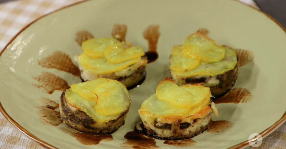 Ungiamo con l’olio gli stampini monoporzione di alluminio e li spolveriamo con del pangrattato. Alla base mettiamo un paio di fettine di funghi saltati, quindi proseguiamo con il pecorino a pezzetti, un paio di fettine di patate lesse, ancora funghi, formaggi e patate. Finiamo con le patate ed una spolverata di pangrattato. Cuociamo in forno preriscaldato e statico a 180° per 20-25 minuti circa. Devono essere ben dorati.