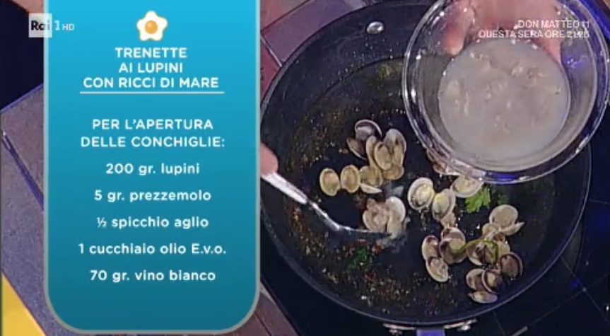- Apertura delle conchiglie: 200 g lupini, 5 g prezzemolo, mezzo spicchio d’aglio, 1 cucchiaio di olio, 70 g vino bianco