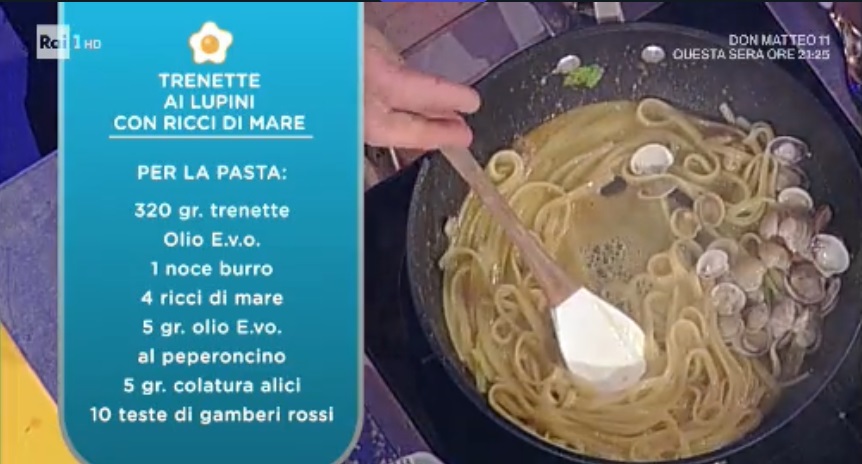 Scoliamo le trenette al dente e le ripassiamo in padella con aglio ed olio. Uniamo la salsa di ricci ed un po’ di lupini. Completiamo la cottura. Se vogliamo, possiamo aggiungere un po’ di ricci puliti e non frullati.