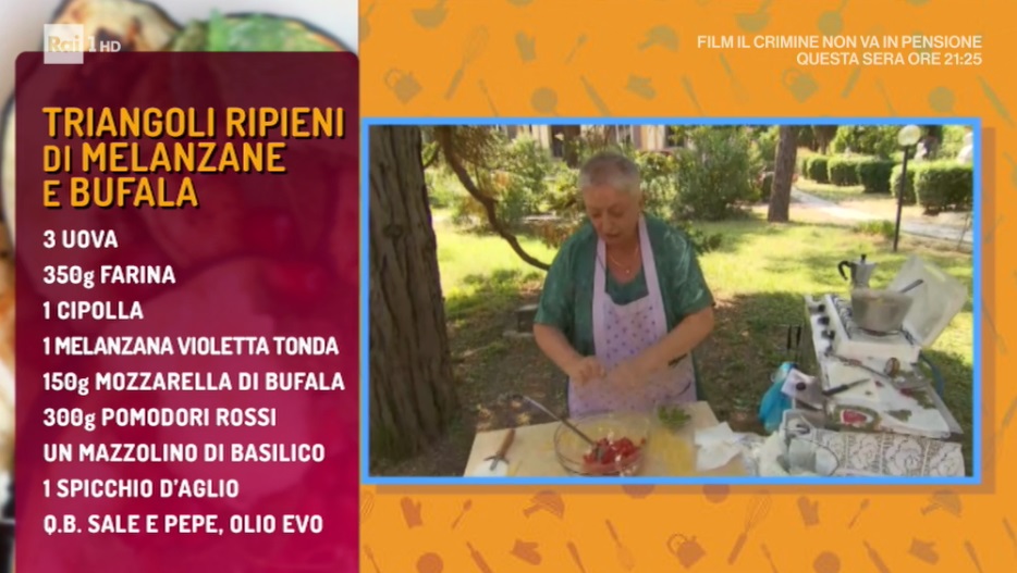 - 3 uova, 350 g farina, 1 cipolla, 1 melanzana violetta tonda, 150 g mozzarella di bufala, 300 g pomodori rossi, un mazzolino di basilico, 1 spicchio d’aglio, sale, pepe, olio evo