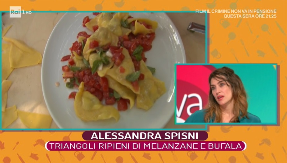 Tagliamo la sfoglia a quadrati, quindi su ogni quadrato mettiamo un po’ di melanzane ed un po’ di mozzarella a dadini. Richiudiamo ciascun quadrato a triangolo, sigillando bene i bordi (meglio inumidirli, prima di chiuderli). Tuffiamo i triangoli in acqua bollente e salata per 3 minuti circa.