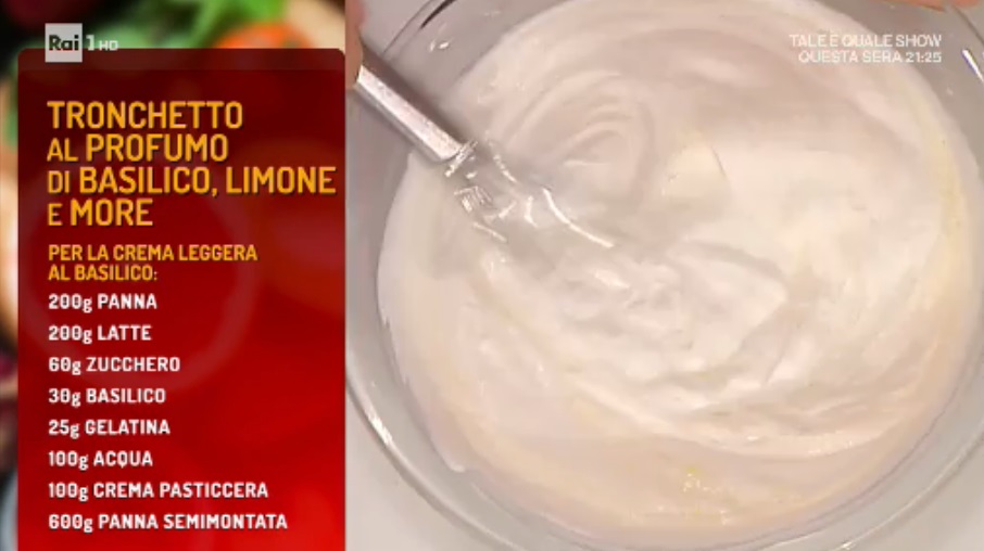 - Crema al basilico: 200 g panna, 200 g latte, 60 g zucchero, 30 g basilico, 25 g gelatina, 100 g acqua, 100 g crema pasticcera, 600 g panna semimontata