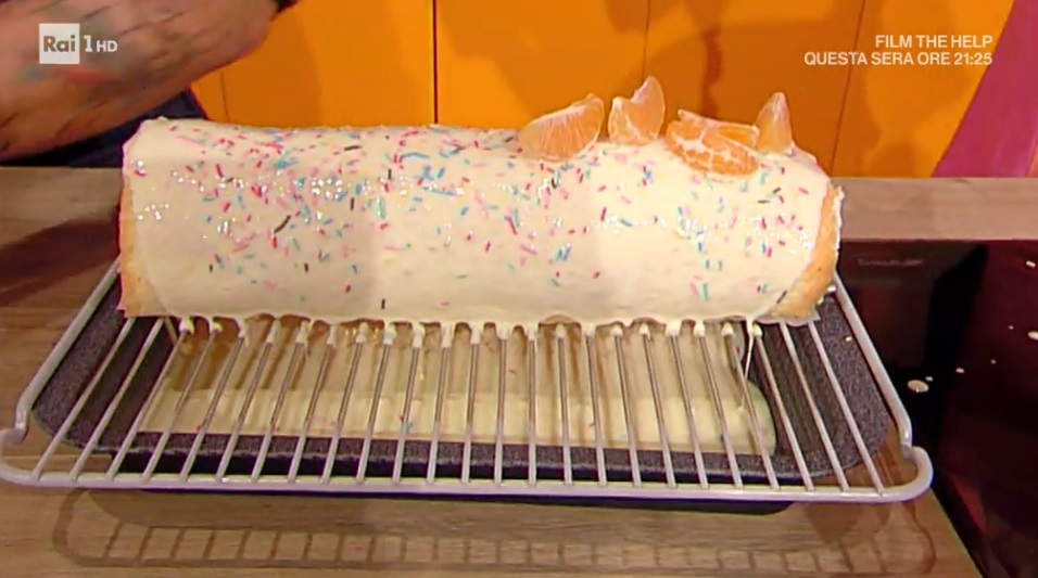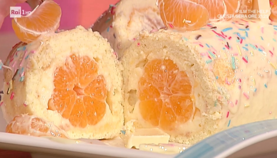 Spalmiamo il pan di Spagna con la crema e, su un lato, disponiamo le clementine sbucciate in fila. Arrotoliamo il rotolo sulle clementine e mettiamo in frigorifero per mezz’ora. Una volta freddo, glassiamo il rotolo con il cioccolato bianco fuso e decoriamo con le codette.