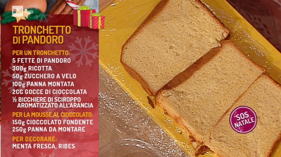 - 5 fette di pandoro, 300 g ricotta, 50 g zucchero a velo, 100 g panna montata, 2 cucchiai gocce di cioccolato, mezzo bicchiere sciroppo all’arancia
