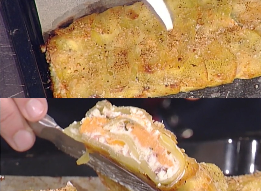 Spalmiamo sul tappeto di patate precotto il formaggio spalmabile morbido. Distribuitelo uniformemente. Disponiamo sopra la pancetta a cubetti tostata in padella. Profumiamo con le erbe aromatiche tritate (rosmarino, dragoncello, coriandolo).