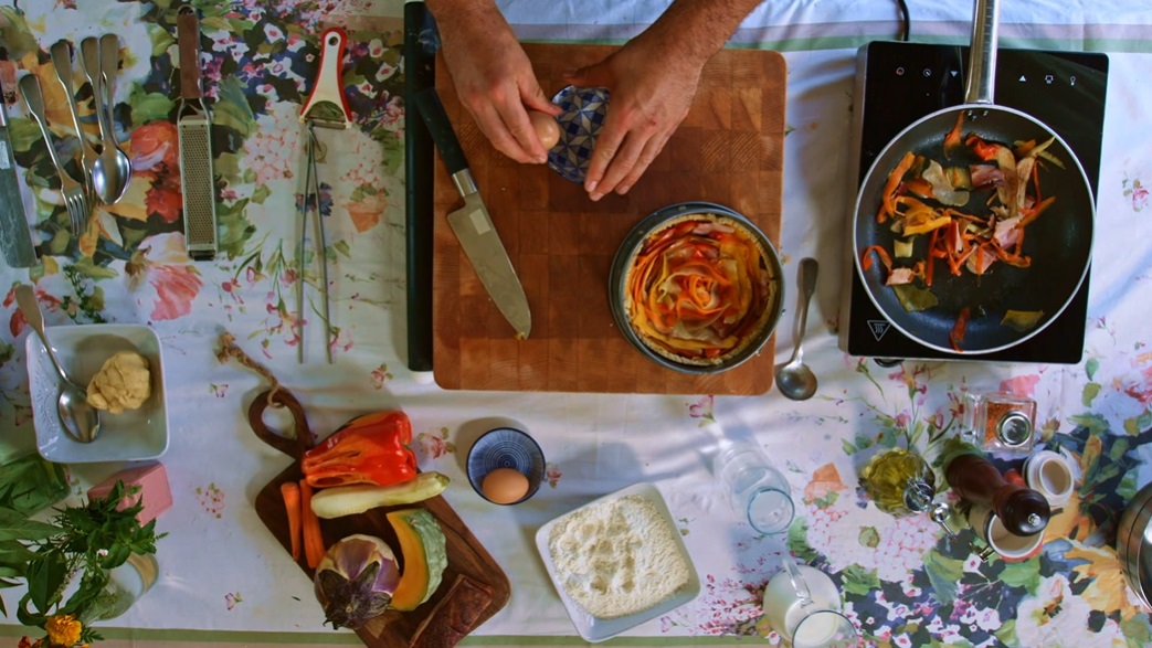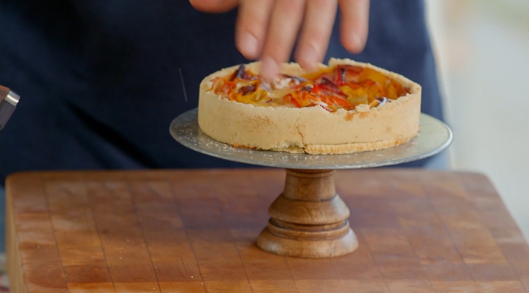 Stendiamo la brisè con il mattarello, ad uno spessore di circa mezzo cm. Foderiamo la tortiera alla base e sui bordi e disponiamo all’interno le verdure con il guanciale, a formare una sorta di vortice. A parte sbattiamo le uova con il latte ed una presa di sale e versiamo la miscela sulle verdure. Passiamo in forno preriscaldato a 170-180° per 30 minuti.