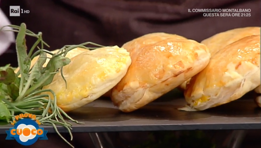 Ricaviamo dalla sfoglia dei dischetti da 9 cm di diametro ed altrettanti da 11 cm. Mettiamo al centro dei dischi più piccoli un cucchiaino di besciamella ed uno di patè. Formiamo un incavo al centro del patè e vi adagiamo il tuorlo, che prima mettiamo a congelare, in modo da rendere più semplice l’operazione. Mettiamo sopra ancora una goccia di besciamella e chiudiamo col disco di sfoglia più grande, sigillando bene i bordi con una forchetta. Spennelliamo con l’uovo e inforniamo a 170° per 10-15 minuti o fino a doratura.