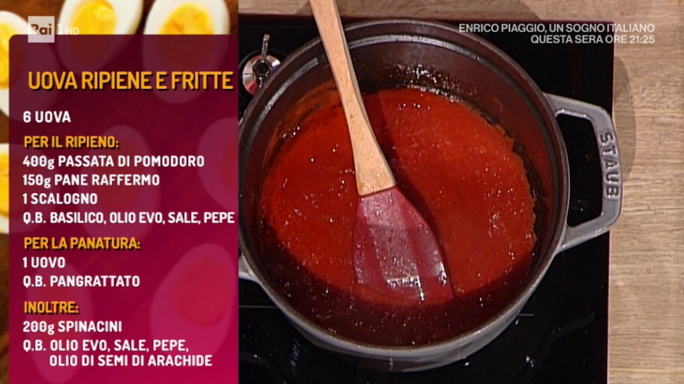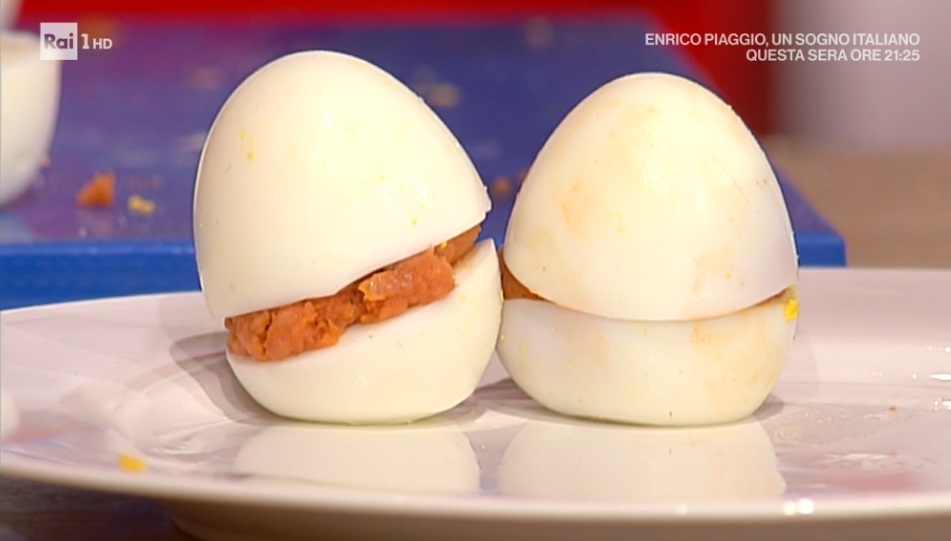 Peliamo le uova sode e le apriamo a metà, prelevando i tuorli. Sostituiamo il tuorlo, all’interno degli albumi, con la pappa al pomodoro e ricomponiamo l’uovo. Passiamo le uova così ricomposte nell’uovo sbattuto e nel pangrattato, meglio se grossolano. Friggiamo in olio ben caldo e profondo fino a doratura.