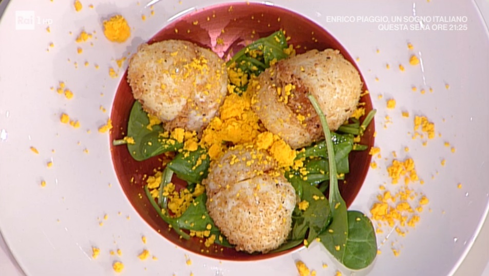 Serviamo le uova su un letto di spinacini crudi conditi con olio e sale e spolveriamo con i tuorli sodi sbriciolati.