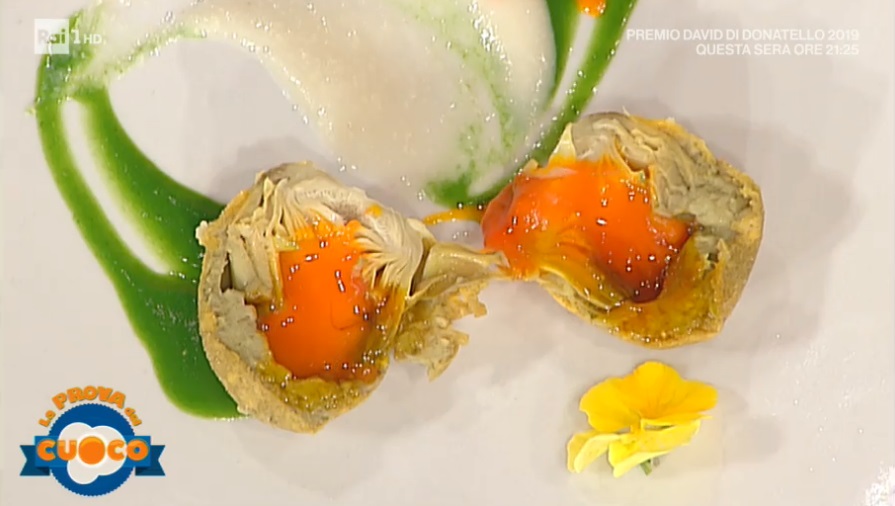 Puliamo i carciofi. Eliminiamo la parte superiore delle foglie (o petali), quindi con uno scavino eliminiamo la parte centrale e, infine, le foglie esterne, quelle più dure. Immergiamo i carciofi preparati in acqua bollente, salata e con dei gambi di prezzemolo. Lasciamo cuocere, coperti, per 10 minuti. Una volta ben cotti, li scoliamo e li raffreddiamo. Li svuotiamo al centro ed inseriamo il tuorlo crudo. Saliamo il tuorlo, copriamo con un cappello di pasta di carciofo e passiamo nell’uovo e nella farina e ancora nell’uovo e nella farina. Immergiamo in olio a 180° e facciamo friggere per 3 minuti esatti.