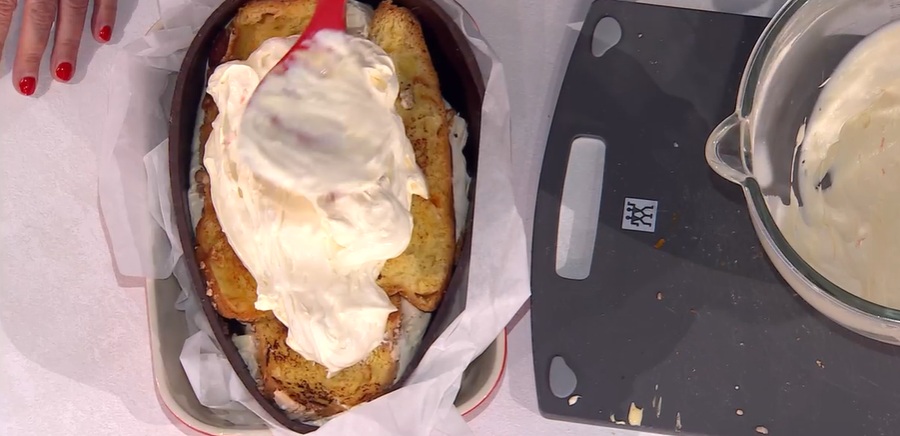 Posizioniamo la metà dell’uovo all’interno di una pirofila, in modo da tenerlo fermo. All’interno, alterniamo strati di crema a fette di colomba tostata. Finiamo con uno strato di crema e mettiamo a riposare in frigorifero.