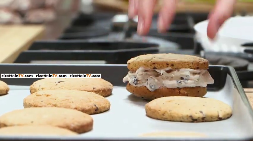 Farcisci alcuni cookies con il gelato alla stracciatella: metti al centro del primo biscotto un cucchiaio abbondante di gelato e ricoprilo con un secondo biscotto esercitando una leggera pressione.