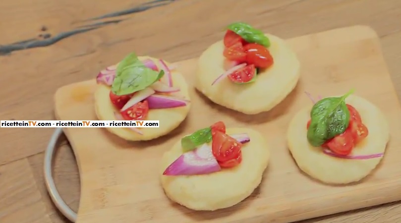 Intanto preparate il condimento. Pulite e tagliate in quattro i pomodorini (potete scegliere tra datterini o ciliegini). Sbucciate la cipolla e tagliatela a fette sottili e mettetela in una ciotola con i pomodorini, il basilico e l’olio evo. Mescolate bene. Quando l’impasto sarà pronto, stendetelo con un matterello (non deve essere troppo sottile) e con un coppapasta e ricavate le vostre pizzelle. Ora andate a friggere in olio di semi. Durante la cottura le pizzelle si gonfieranno. Scolatele quando saranno ben dorate. Schiacciate le pizzelle al centro per creare una piccola conca e riempitele con i pomodorini e le cipolle condite.