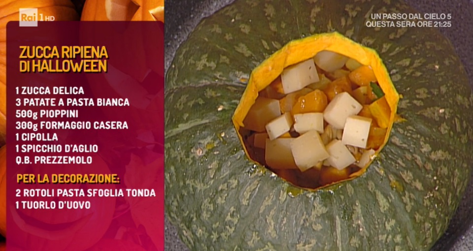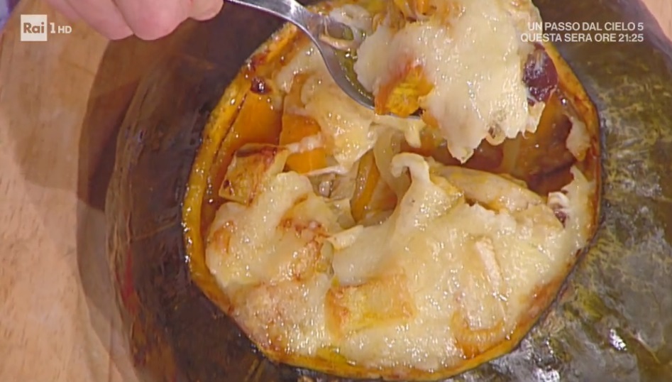 All’interno della zucca scavata, mettiamo un po’ di formaggio casera a cubetti, parte delle verdure passate in padella, ancora casera a cubetti, ripieno di verdure, casera, verdure e finiamo con il formaggio casera a cubetti. Cuociamo in forno preriscaldato e statico a 200° per 1 ora.