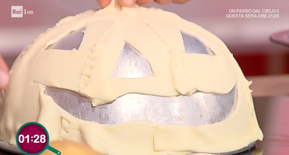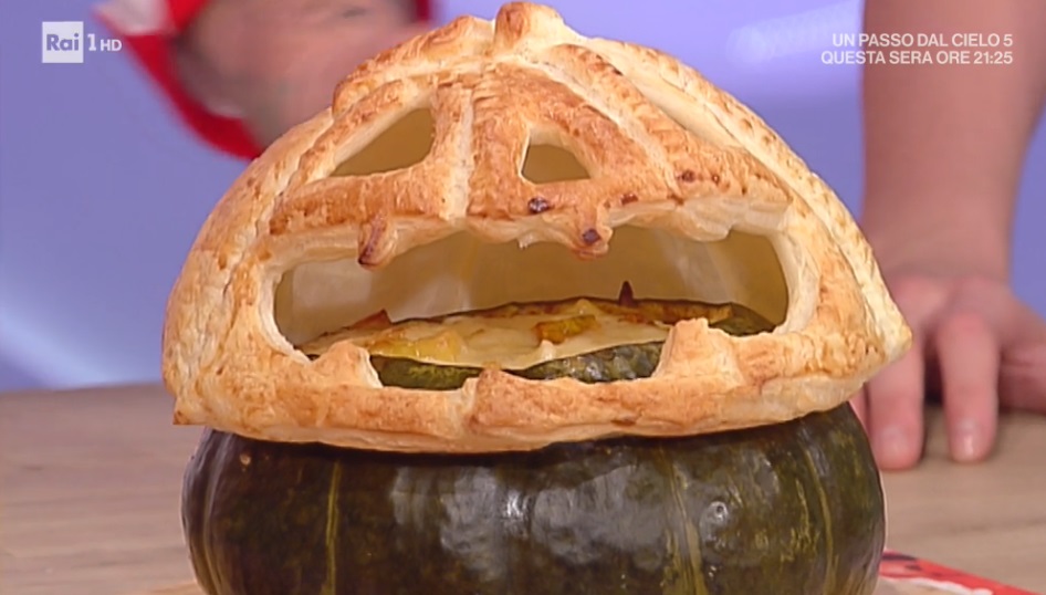 Con la pasta sfoglia già pronta, ritagliamo dei triangoli e li adagiamo sopra uno stampo a zuccotto imburrato, sovrapponendoli, in modo da coprire interamente lo zuccotto. Decoriamo con una forchetta ed un coltello, come fosse una zucca stregata. Spennelliamo con il tuorlo sbattuto insieme ad un po’ di latte e cuociamo in forno preriscaldato a 200° fino a doratura (20 minuti circa). Useremo questa zucca di pasta sfoglia come coperchio.