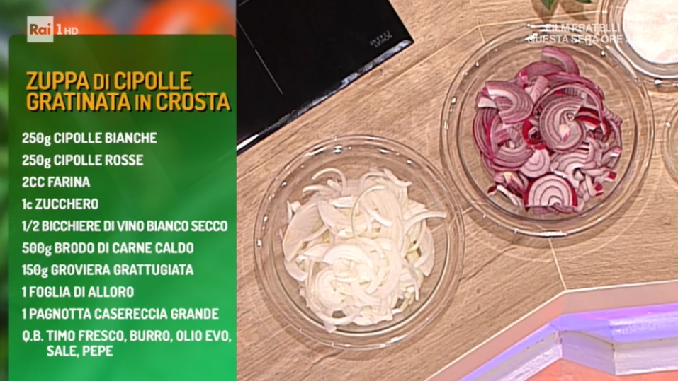 - 250 g cipolle bianche, 250 g cipolle rosse, 2 cc farina, 1 c zucchero, mezzo bicchiere di vino bianco, 500 g brodo di carne caldo, 150 g groviera grattugiata, 1 foglia di alloro, 1 pagnotta casereccia grande, timo, burro, olio evo, sale, pepe